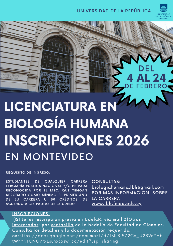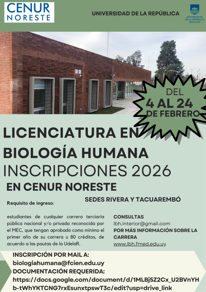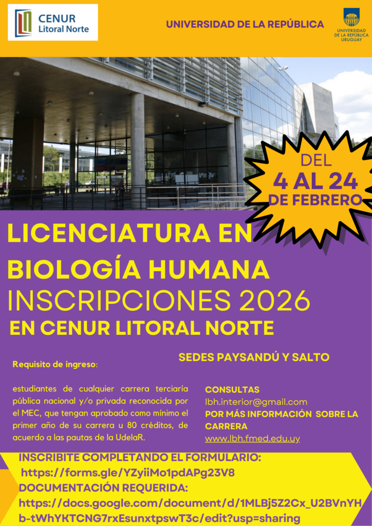 Del 4 al 26 de febrero están abiertas las inscripciones a la Licenciatura en Biología Humana, para Montevideo, Cenur Litoral Norte y Cenur Noreste.